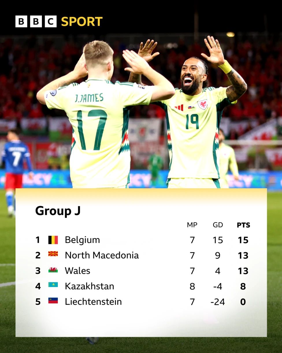 With Wales and North Macedonia neck-and-neck on 13 points, whoever wins on Tuesday will take the runners-up spot.
